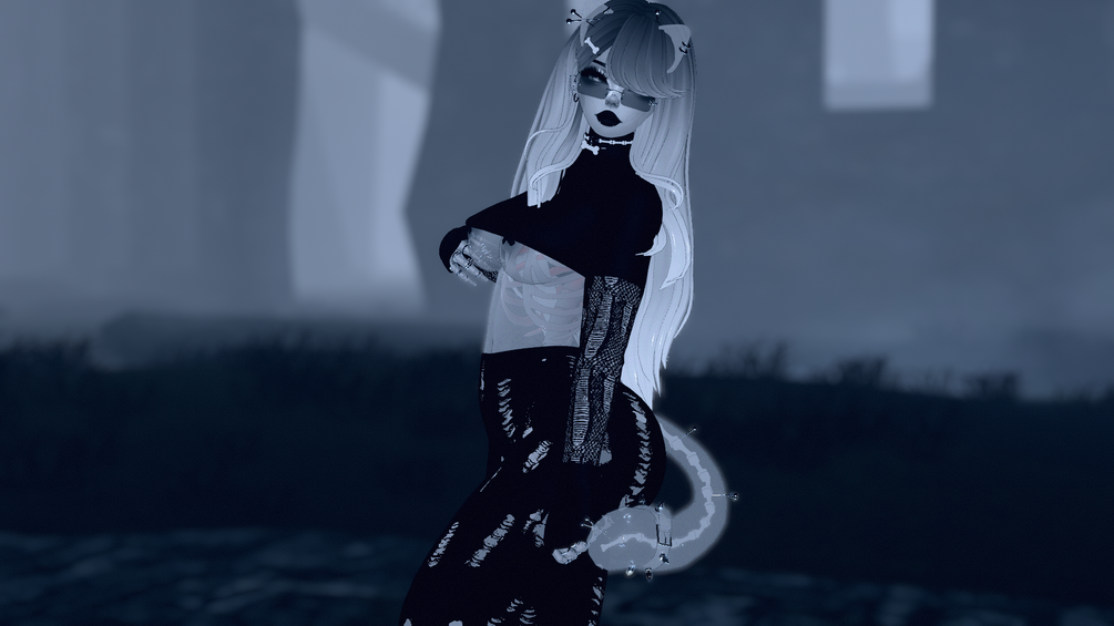 Body - Zinpia | Head - Zinpia | Nipple Texture - Weeeby | Face Texture - Miing | Lashes - Seakaii | Nose Chain - | Nose Ring - MilkyMutt | Lip Piercings - MilkyMutt | Eye Textures - Cupkake | Skull - shadowofthygods | Bone Choker - Cupkake | Pants - Nauuki | Cat Set - Wen | Puppy set - Wen | Glasses - Hayweee | Greenie Hair - Nessy! | Heels - Nauuki | HairClips - Cupkake | Hoodie - Sadge | Jennifer Hair - Nessy! | Miki Hair - Saikura | Rings - miyu! | Skeleton - Melting3D | Bodysuit - Nauuki | Socks - Nauuki | Top - Nauuki | Pasties - Emchie | DPS System by Raliv | GoGo Locomotion | VRC Avatar Tools: Fluff's Toolbox | Marker by Vrlabs |